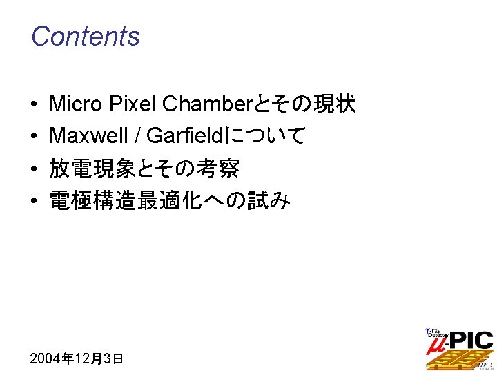 Micro Pixel Chamber (m-PIC) • PCB technology • Pixel electrode • 2 D readout 100 mm • 400 m pitch electrodes • 256 anodes and 256 cathodes 2004年 12月3日 10 cm Detection area = 100 cm 2