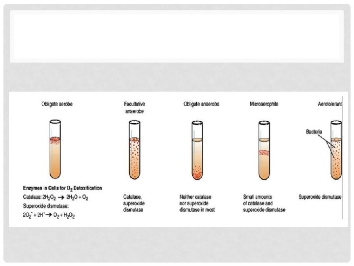 7. GASEOUS ATMOSPHERE • O 2 can be converted into a number of compounds that are highly toxic such as: ü Superoxide O 2ü Hydrogen peroxide H 2 O 2 § To survive this the bacteria must have enzymes that can convert these toxic derivatives to nontoxic forms, these enzymes include: ü Superoxide dismutase ü catalase