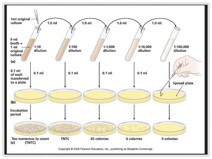 THE VIABLE PLATE COUNT METHOD 1. Serial dilutions of the sample are prepared. 2. From each dilution, 1 ml or 0. 1 ml is inoculated on Nutrient Agar media. 3. All the plates are incubated for 24 hours at 37°C. 4. After incubation, the bacterial colonies are counted from the plates. Then the number is multiplied by the dilution factor to get the number of bacteria in the original sample.