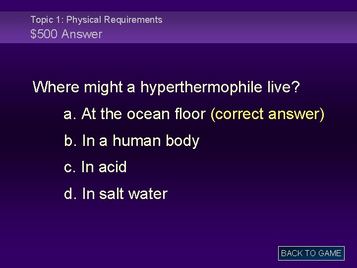 Topic 1: Physical Requirements $500 Answer Where might a hyperthermophile live? a. At the ocean floor (correct answer) b. In a human body c. In acid d. In salt water BACK TO GAME