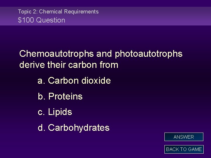 Topic 2: Chemical Requirements $100 Question Chemoautotrophs and photoautotrophs derive their carbon from a. Carbon dioxide b. Proteins c. Lipids d. Carbohydrates ANSWER BACK TO GAME