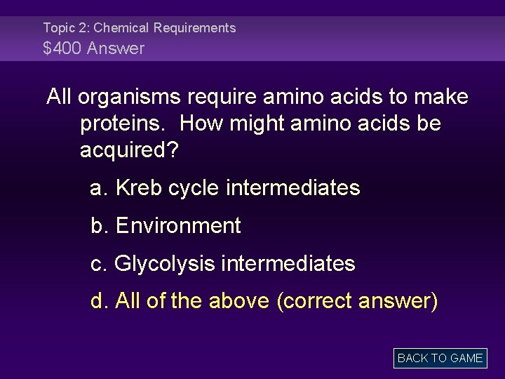 Topic 2: Chemical Requirements $400 Answer All organisms require amino acids to make proteins. How might amino acids be acquired? a. Kreb cycle intermediates b. Environment c. Glycolysis intermediates d. All of the above (correct answer) BACK TO GAME