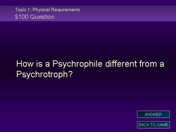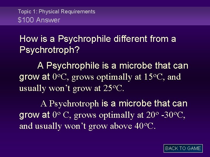 Topic 1: Physical Requirements $100 Answer How is a Psychrophile different from a Psychrotroph? A Psychrophile is a microbe that can grow at 0 o. C, grows optimally at 15 o. C, and usually won’t grow at 25 o. C. A Psychrotroph is a microbe that can grow at 0 o C, grows optimally at 20 o -30 o. C, and usually won’t grow above 40 o. C. BACK TO GAME