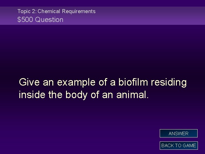 Topic 2: Chemical Requirements $500 Question Give an example of a biofilm residing inside the body of an animal. ANSWER BACK TO GAME