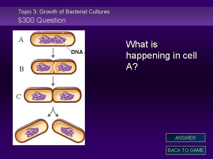 Topic 3: Growth of Bacterial Cultures $300 Answer A B C What is happening in cell A? Correct answer: DNA Replication BACK TO GAME