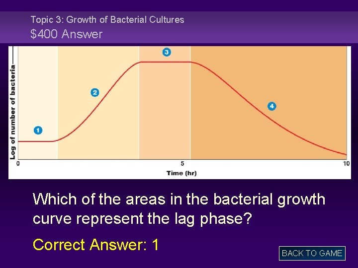 Topic 3: Growth of Bacterial Cultures $400 Answer Which of the areas in the bacterial growth curve represent the lag phase? Correct Answer: 1 BACK TO GAME