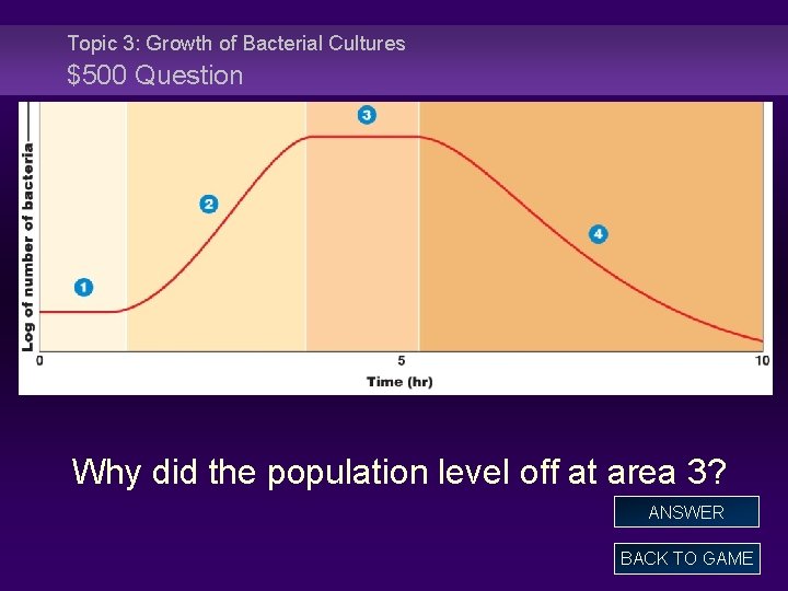 Topic 3: Growth of Bacterial Cultures $500 Question Why did the population level off at area 3? ANSWER BACK TO GAME
