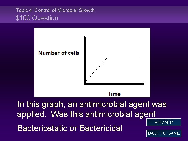 Topic 4: Control of Microbial Growth $100 Answer In this graph, an antimicrobial agent was applied. Was this antimicrobial agent Bacteriostatic (correct answer) BACK TO GAME