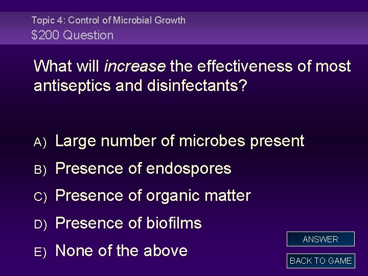 Topic 4: Control of Microbial Growth $200 Question What will increase the effectiveness of most antiseptics and disinfectants? A) Large number of microbes present B) Presence of endospores C) Presence of organic matter D) Presence of biofilms E) None of the above ANSWER BACK TO GAME