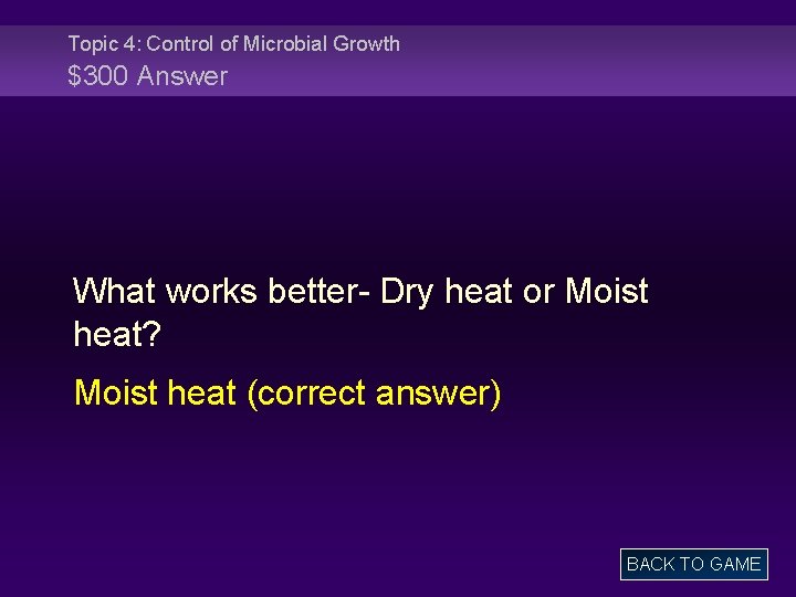 Topic 4: Control of Microbial Growth $300 Answer What works better- Dry heat or Moist heat? Moist heat (correct answer) BACK TO GAME