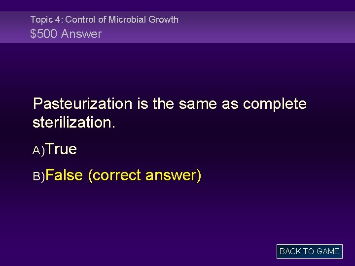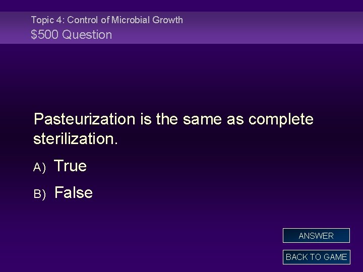 Topic 4: Control of Microbial Growth $500 Question Pasteurization is the same as complete sterilization. A) True B) False ANSWER BACK TO GAME