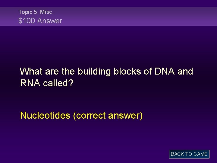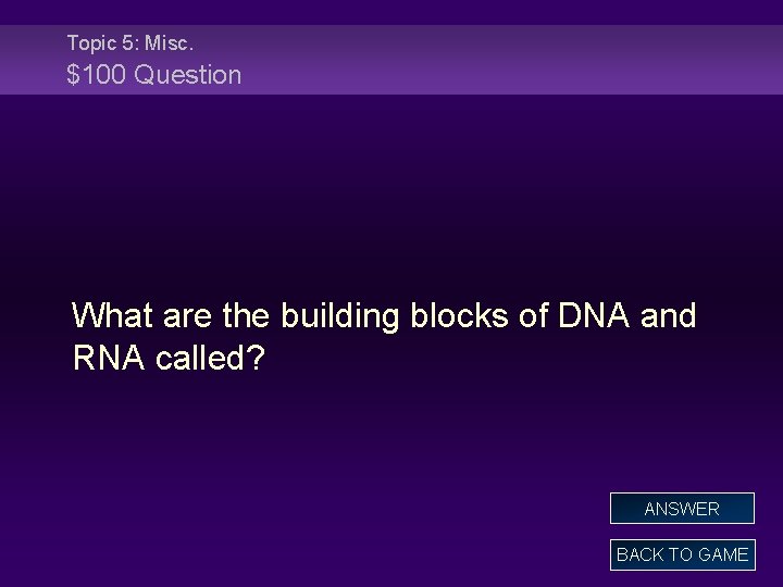 Topic 5: Misc. $100 Answer What are the building blocks of DNA and RNA called? Nucleotides (correct answer) BACK TO GAME