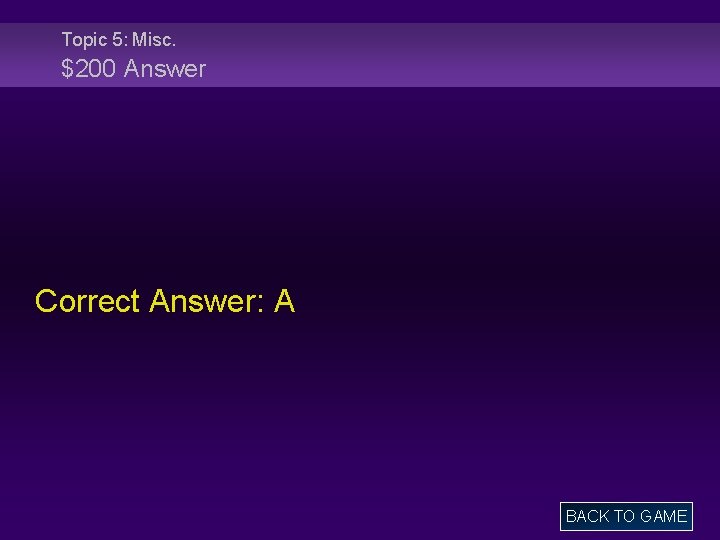 Topic 5: Misc. $200 Answer Correct Answer: A BACK TO GAME