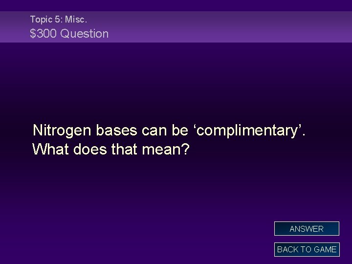 Topic 5: Misc. $300 Question Nitrogen bases can be ‘complimentary’. What does that mean? ANSWER BACK TO GAME