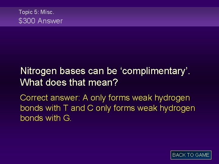 Topic 5: Misc. $300 Answer Nitrogen bases can be ‘complimentary’. What does that mean? Correct answer: A only forms weak hydrogen bonds with T and C only forms weak hydrogen bonds with G. BACK TO GAME
