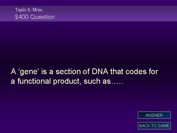 Topic 5: Misc. $400 Answer A ‘gene’ is a section of DNA that codes for a functional product, such as…. . Correct Answer: A protein (primarily) BACK TO GAME