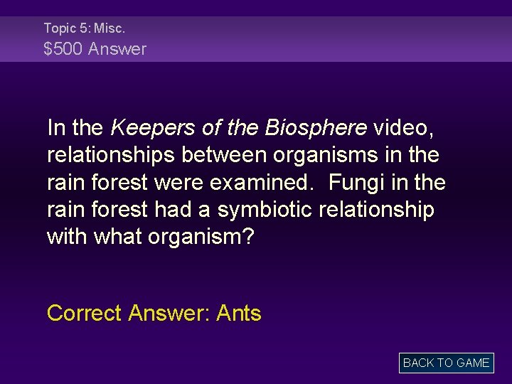 Topic 5: Misc. $500 Answer In the Keepers of the Biosphere video, relationships between organisms in the rain forest were examined. Fungi in the rain forest had a symbiotic relationship with what organism? Correct Answer: Ants BACK TO GAME
