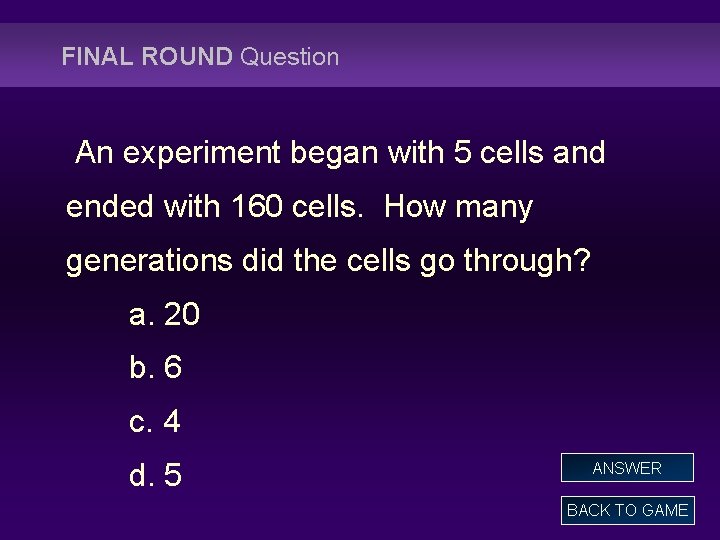 FINAL ROUND Answer An experiment began with 5 cells and ended with 160 cells. How many generations did the cells go through? a. 20 b. 6 c. 4 d. 5 (correct answer) BACK TO GAME