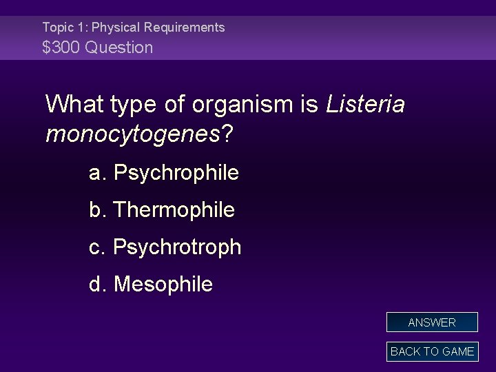 Topic 1: Physical Requirements $300 Question What type of organism is Listeria monocytogenes? a. Psychrophile b. Thermophile c. Psychrotroph d. Mesophile ANSWER BACK TO GAME
