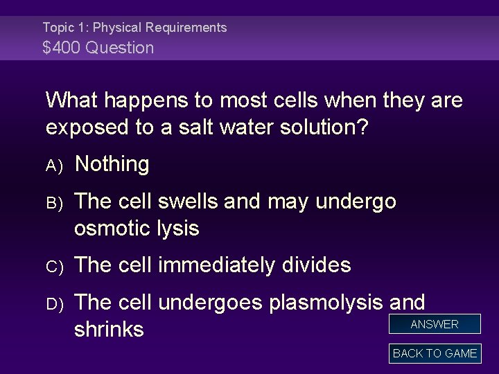 Topic 1: Physical Requirements $400 Question What happens to most cells when they are exposed to a salt water solution? A) Nothing B) The cell swells and may undergo osmotic lysis C) The cell immediately divides D) The cell undergoes plasmolysis and ANSWER shrinks BACK TO GAME