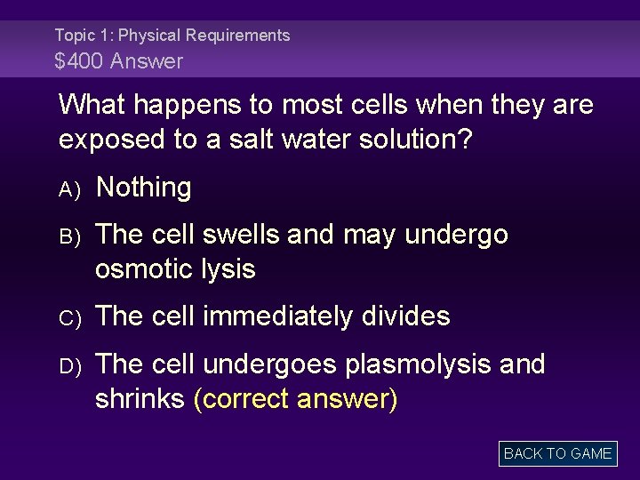 Topic 1: Physical Requirements $400 Answer What happens to most cells when they are exposed to a salt water solution? A) Nothing B) The cell swells and may undergo osmotic lysis C) The cell immediately divides D) The cell undergoes plasmolysis and shrinks (correct answer) BACK TO GAME