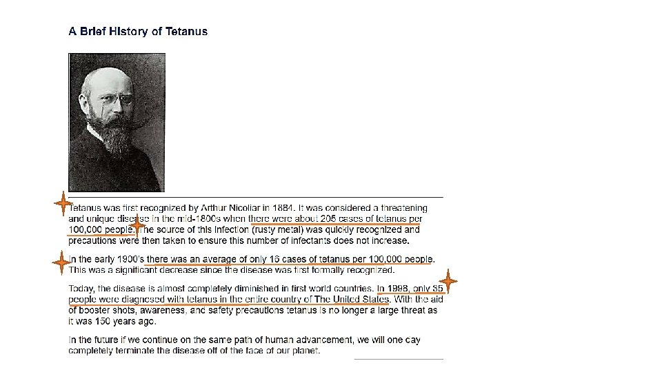 Tetanus Signs and symptoms • Tetanus symptoms usually emerge about 7 -10 days after initial infection, however, this can vary from 4 days to about 3 weeks, and, in some cases, it may take months. • In general, the further the injury site is from the central nervous system, the longer the incubation period. “Patients with shorter incubation times tend to have more severe symptoms”. Ø Common signs include: # Spasms and stiffness in jaw muscles (trismus), (a rigid smile) # Stiffness of neck muscles # Difficulty swallowing # Stiffness of abdominal muscles Ø Possible other signs include: Fever Sweating Rapid heart rate(Tachycardia) Diarrhea: Bloody stools (feces)