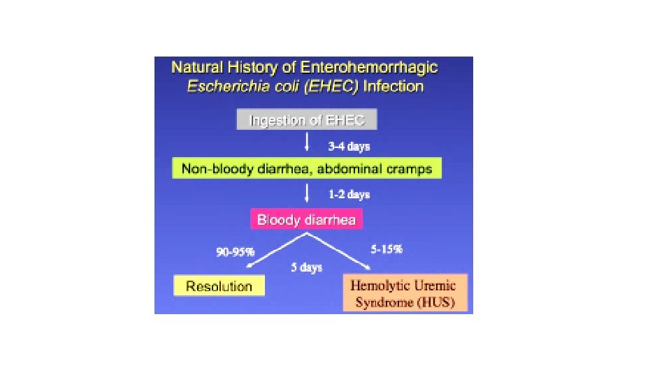 Pathogenesis of E. coli : Shiga toxin-producing E. coli (STEC). • The most commonly heard about in the news in association with foodborne outbreaks. • E. coli O 157: H 7 >> { (EHEC) serotype} is the worst type of E. coli: >> it causes bloody diarrhea >> it can sometimes cause kidney failure and even death. • STEC can grow in temperatures ranging from 7 °C to 50 °C, with an optimum temperature of 37 °C. Some STEC can grow in acidic foods, down to a p. H of 4. 4. • STEC is destroyed by thorough cooking of foods until all parts reach a temperature of 70 °C or higher. • An estimated 73, 000 cases of these E. coli infections occur in the U. S. every year, according to the CDC. Verotoxin= Shiga toxin E. coli O 157: H 7 = Shiga toxin-producing E. coli (STEC)> Enterohemorrhagic (EHEC)