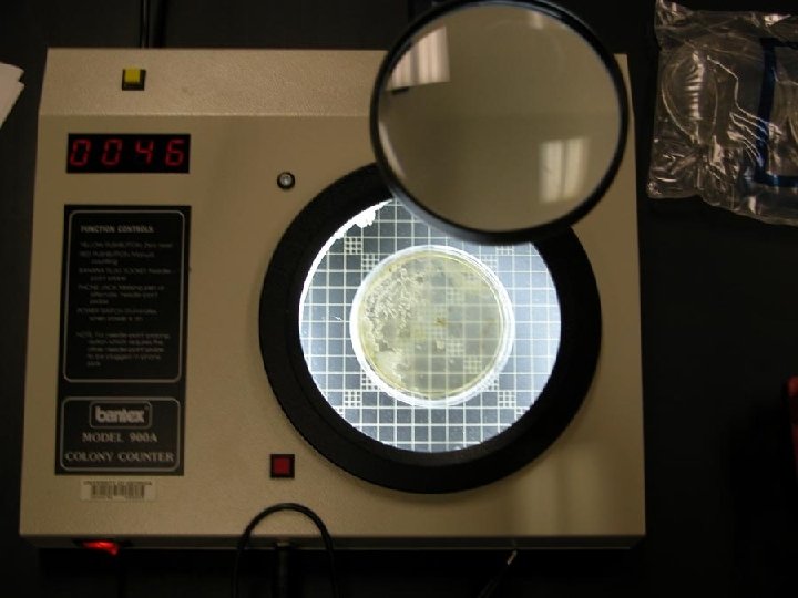 Counting Plates ü If a commercial plate counter is not available, you can Xerox 1 mm square graph paper and use it as a grid for colony counting. You would need to estimate the total surface area (in mm 2) by counting the number of squares in a dish. ü If using a commercial plate counter, touch each colony on the plate with the pen, and the cumulative number of colonies will appear on the display.