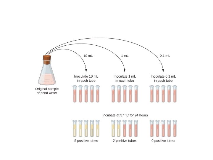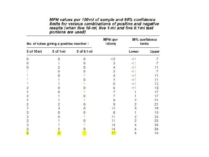 Untreated Water • Take 5 tubes of double strength and 10 tubes of single strength for each water sample to be tested. • Using a sterile pipette add 10 ml of water to 5 tubes containing 10 ml double strength medium. • Similarly add 1 ml of water to 5 tubes containing 10 ml double strength medium and 0. 1 ml water to remaining 5 tubes containing 10 ml double strength medium. • Incubate all the tubes at 37°C for 24 hrs. If no tubes appear positive re-incubate up to 48 hrs. • Compare the number of tubes giving positive reaction to a standard chart and record the number of bacteria present in it. For example: a water sample tested shows a result of 3– 2– 1 (3 × 10 ml positive, 2 × 1 ml positive, 1 × 0. 1 ml positive) gives an MPN value of 17, i. e. the water sample contains an estimated 17 coliforms per 100 ml •
