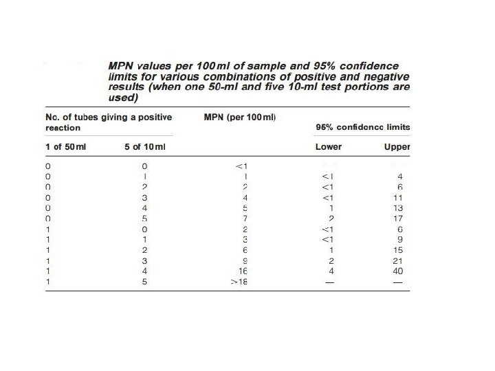 For treated water Ø Take 1 tube of single strength (50 ml) and 5 tubes of double strength (10 ml) for each water sample to be tested. Ø Using a sterile pipette add 50 ml of water to the tubes containing 50 ml single strength medium. Ø Similarly add 10 ml of water to 5 tubes containing 10 ml double strength medium Incubate the tubes at 37°C for 24 hrs. If no tubes appear positive re-incubate up to 48 hrs. Ø Compare the number of tube giving positive reaction to a standard chart and record the number of bacteria present in it. For example: a water sample tested shows a result of 1 -4 (1 × 50 ml positive, 4 × 10 ml positive) gives an MPN value of 16, i. e. the water sample contains an estimated 16 coliforms per 100 ml •