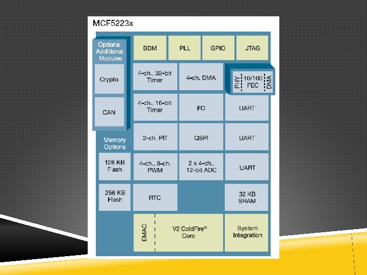 INTERFACES Y OTROS PERIFÉRICOS Módulos de criptografía Stack TCP/IP (para módulos ethernet) IEEE 1149. 1 Test Access Port (JTAG) DMA Timers QSPI (Queued SPI) Ez. Port, para programar la memoria flash interna desde flash externas en forma directa LCD controllers . . .