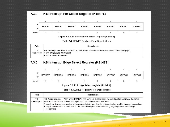 INTERRUPCIONES Ejemplo inicialización: void Init. KBI() { /*KBI 1 Init*/ KBI 1 SC_KBIE = 0; KBI 1 ES_KBEDG 3 = 0; KBI 1 ES_KBEDG 2 = 0; KBI 1 PE_KBIPE 3 = 1; KBI 1 PE_KBIPE 2 = 1; KBI 1 SC_KBIMOD = 0; KBI 1 SC_KBACK = 1; KBI 1 SC_KBIE = 1; } //end Init. KBI // // Mask KBI 1 interrupts KBI 1 P 3 internal pull-up, falling edge/low level KBI 1 P 2 internal pull-up, falling edge/low level Enable KBI 1 P 3 interrupts Enable KBI 1 P 2 interrupts Detect edges only Clear possible false interrupts Enable KBI 1 interrupts