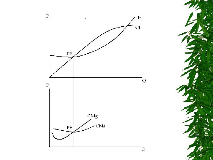 La pendiente del ingreso total esta dado por el precio (P), y la pendiente del costo total esta dado por el costo variable (Cv), siendo el P mayor a Cv entonces ambas líneas en algún punto se cruzan, siendo este punto el de equilibrio entre el ingreso total y el costo total, donde el beneficio es cero. La sombra roja indica el área de las pérdidas y el área verde es de beneficios.