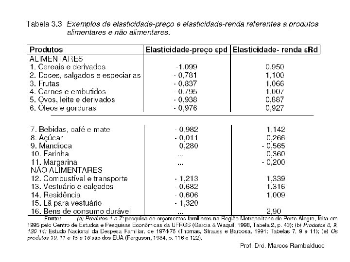 Fonte: para os itens de Alimentação, Hoffman, R. (2000). Elasticidades-renda das despesas e do consumo físico de alimentos no Brasil metropolitano em 1995 -1996. Agricultura em São Paulo, SP, 47(1): 111 -122, 2000. Para os Outros Itens, James Seale, Jr. , Anita Regmi, and Jason A. Bernstein (2003). International Evidence on Food Consumption Patterns. ERS-Economic Research Service of the United States Department of Agricultural. Technical Bulletin No. (TB 1904) 70 p, October. Elasticidade-renda para o Brasil Item Elasticidade média Alimentação (Consumo Físico de Alimentos – em Kg per capita - 0, 005 Arroz polido - 0, 070 Feijão - 0, 400 Farinha d e mandioca Macarrão com ovos Maçã Filé e filé mignon Óleo de milho Azeite de oliva Cuidados Médicos Educação Lazer 0, 246 0, 460 1, 344 0, 997 1, 026 Outros Itens 1, 348 1, 075 1, 455