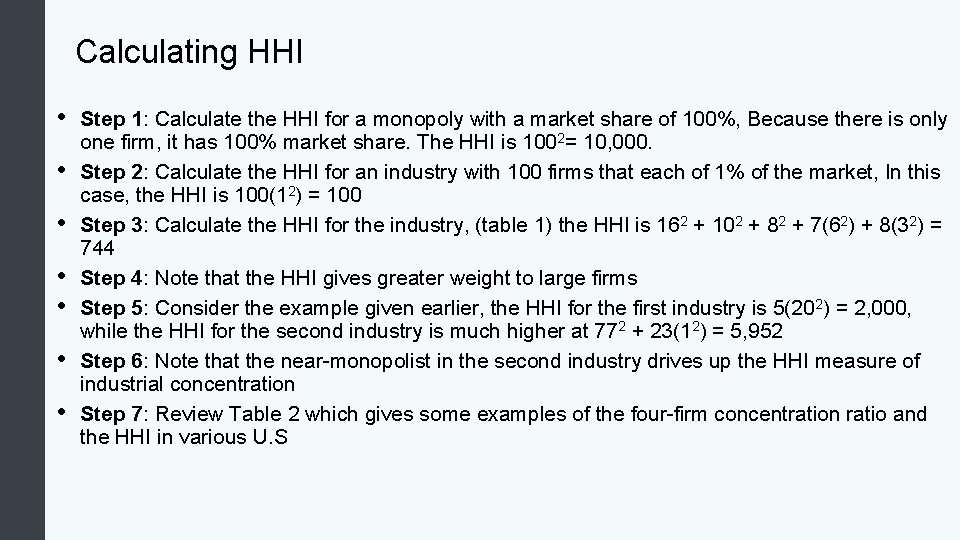 Calculating HHI • • Step 1: Calculate the HHI for a monopoly with a market share of 100%, Because there is only one firm, it has 100% market share. The HHI is 1002= 10, 000. Step 2: Calculate the HHI for an industry with 100 firms that each of 1% of the market, In this case, the HHI is 100(12) = 100 Step 3: Calculate the HHI for the industry, (table 1) the HHI is 162 + 102 + 82 + 7(62) + 8(32) = 744 Step 4: Note that the HHI gives greater weight to large firms Step 5: Consider the example given earlier, the HHI for the first industry is 5(202) = 2, 000, while the HHI for the second industry is much higher at 772 + 23(12) = 5, 952 Step 6: Note that the near-monopolist in the second industry drives up the HHI measure of industrial concentration Step 7: Review Table 2 which gives some examples of the four-firm concentration ratio and the HHI in various U. S