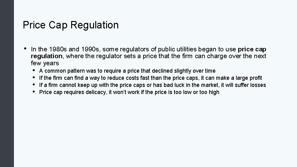Price Cap Regulation • In the 1980 s and 1990 s, some regulators of public utilities began to use price cap regulation, where the regulator sets a price that the firm can charge over the next few years • • A common pattern was to require a price that declined slightly over time If the firm can find a way to reduce costs fast than the price caps, it can make a large profit If a firm cannot keep up with the price caps or has bad luck in the market, it will suffer losses Price cap requires delicacy, it won’t work if the price is too low or too high