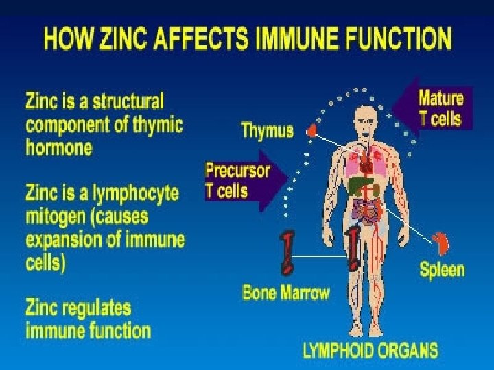Zinc in growth and respiratory infection • Zinc-deficient Bangladeshi infants showed improvements in growth rate and a reduced incidence of acute lower respiratory infection after zinc supplementation. In infants with serum zinc concentrations > 9. 18 micro mol/L, supplementation improved only biochemical zinc status. Osendarp SJ, Santosham M, Black RE, Wahed MA, van Raaij JM, Fuchs GJ. Am J Clin Nutr. 2002 Dec; 76(6): 1401 -8.