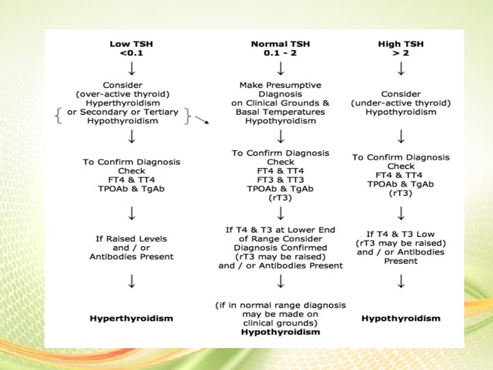 Clinical uses of TSH • The principal clinical use for h. TSH measurement is for the assessment of thyroid status. In patients with intact hypothalamic-pituitary function, h. TSH is measured to: 1. Exclude hypothyroidism or hyperthyroidism 2. Monitor T 4 replacement treatment in primary hypothyroidism or antithyroid treatment in hyperthyroidism; 3. Follow T 4 suppression of the trophic influence of h. TSH in “cold nodules” and non-toxic goiter; 4. Assess the response to thyrotropin-releasing hormone (TRH) stimulation testing.