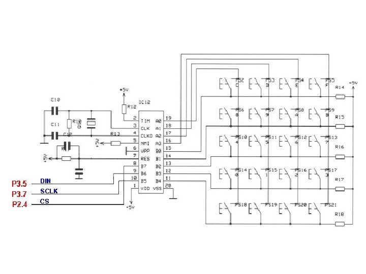 TECLADO Cuando el microprocesador 80386 EX interroga el microcontrolador a través del bus de serie, este último vuelve el código de la tecla presionada. La línea P 2. 4 del microprocesador 80386 EX es utilizada para generar la señal de habilitación (CS) para el microcontrolador. Las líneas P 3. 5 y P 3. 7 son utilizados respectivamente para leer los datos que proceden del microcontrolador y para generar el clock de lectura. La operación de lectura ha sido desarrollada por la interrupción software 09 H.