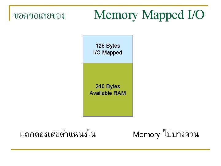 Microprocessor and Interfacing 261313 PIC Code Execution II Slides: 19 Download presentation Microprocessor and Interfacing 261313 PIC Code Execution II http: //www. e-cpe. org/moodle Memory Mapped I/O MOVWF W 06 ขอดขอเสยของ Memory Mapped I/O MOVWF 06 MOVWF 21 Slow I/O Operation Fast Mem Operation ถา Memory และ I/O ใช data bus เดยวกน Access ชาลง อาจทำให Memory Machine Code Generation Methods Options n n n Write Machine Code Write Assembly Code Use a High-Level Compiler Writing Machine Code ENIAC Drawbacks of High-Level Compilers n Poor optimization n Non-Optimal Hardware Utilization Poor Optimazation. . . . . 001 A: BSF 03. 5 001 B: CLRF 06 001 C: BCF 03. 5 001 D: MOVF 21, W 001 E: MOVWF 06 while (1) { output_b(i); Poor Optimization Ex 2. . . . . 000 D: MOVLW 05 000 E: BCF 03. 5 000 F: MOVWF 21. . . . . 0010: DECF 21, F. . . . . 0011: MOVF 21, F 0012: BTFSS 03. 2 0013: GOTO 010 int i; i = 5; do { i--; } while (i>0); Non-Optimal HW Utilization RLF Equivalent Program in ASM BCF 03. 5 MOVF 0 x 21, W MOVWF 06 RLF 0 x 21, F GOTO 0 x 1 A File Register Map Status Register (Address 03)
