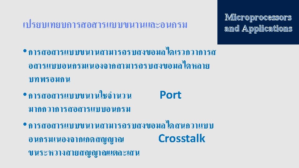 Microprocessors and Applications การสอสารแบบดจตอล • การสอสารแบบดจตอลสามารถแบงออกเปน 1. การสอสารแบบขนาน 2 กลมคอ (Parallel Communication) § IEEE 488 หรอ General Purpose Interface Bus (GPIB) § IEEE 1248 หรอ Centronics Parallel Protocol § SCSI (Small Computer System Interface) § IDE (Integrated Drive Electronics) § ISA (Industrial Standard Architecture) § PCI (Peripheral Component Interconnect) § AGP (Accelerated Graphics Port)