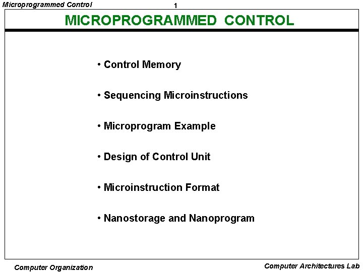 Microprogrammed Control 1 MICROPROGRAMMED CONTROL • Control Memory • Sequencing Microinstructions • Microprogram Example • Design of Control Unit • Microinstruction Format • Nanostorage and Nanoprogram Computer Organization Computer Architectures Lab