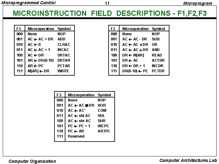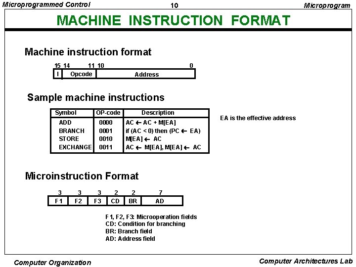 Microprogrammed Control 10 Microprogram MACHINE INSTRUCTION FORMAT Machine instruction format 15 14 11 10 Opcode I 0 Address Sample machine instructions Symbol ADD BRANCH STORE EXCHANGE OP-code 0000 0001 0010 0011 Description AC + M[EA] if (AC < 0) then (PC EA) M[EA] AC AC M[EA], M[EA] AC EA is the effective address Microinstruction Format 3 F 1 3 F 2 3 F 3 2 CD 2 BR 7 AD F 1, F 2, F 3: Microoperation fields CD: Condition for branching BR: Branch field AD: Address field Computer Organization Computer Architectures Lab