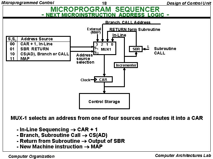 Microprogrammed Control 17 DESIGN OF CONTROL UNIT Design of Control Unit - DECODING ALU CONTROL INFORMATION microoperation fields F 1 F 2 F 3 3 x 8 decoder 7 6 54 3 21 0 76 54 3 21 0 AND ADD Arithmetic logic and shift unit DRTAR PCTAR DRTAC From PC DR(0 -10) Select Load Computer Organization Load AC DR AC 0 1 Multiplexers AR Clock Computer Architectures Lab