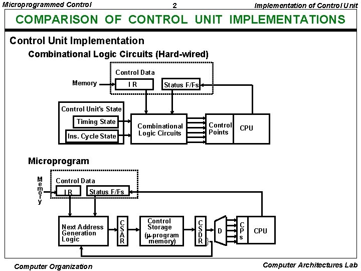 Microprogrammed Control 2 Implementation of Control Unit COMPARISON OF CONTROL UNIT IMPLEMENTATIONS Control Unit Implementation Combinational Logic Circuits (Hard-wired) Control Data Memory IR Status F/Fs Control Unit's State Timing State Control Points Combinational Logic Circuits Ins. Cycle State CPU Microprogram M e m o r y Control Data IR Status F/Fs Next Address Generation Logic Computer Organization C S A R Control Storage ( -program memory) C S D R D } C P s CPU Computer Architectures Lab