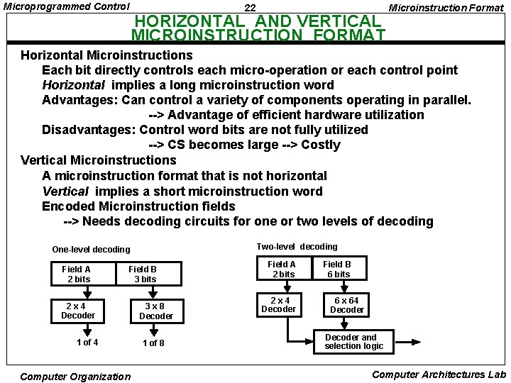 Microprogrammed Control 21 Microinstruction Format MICROINSTRUCTION FORMAT Information in a Microinstruction - Control Information - Sequencing Information - Constant Information which is useful when feeding into the system These information needs to be organized in some way for - Efficient use of the microinstruction bits - Fast decoding Field Encoding - Encoding the microinstruction bits - Encoding slows down the execution speed due to the decoding delay - Encoding also reduces the flexibility due to the decoding hardware Computer Organization Computer Architectures Lab