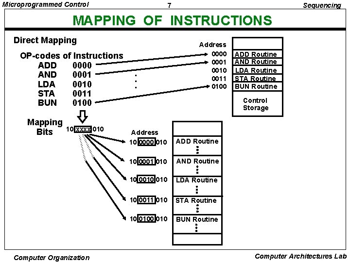 Microprogrammed Control 7 Sequencing MAPPING OF INSTRUCTIONS Direct Mapping OP-codes of Instructions ADD 0000 AND 0001 LDA 0010 STA 0011 BUN 0100 Mapping Bits 10 xxxx 010 Computer Organization . . . Address 0000 0001 0010 0011 0100 ADD Routine AND Routine LDA Routine STA Routine BUN Routine Control Storage Address 10 0000 010 ADD Routine 10 0001 010 AND Routine 10 0010 LDA Routine 10 0011 010 STA Routine 10 010 BUN Routine Computer Architectures Lab