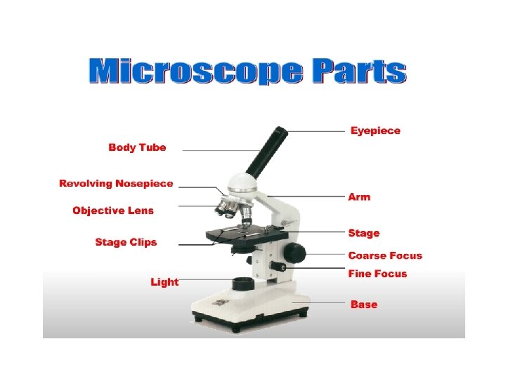 Parts of the Microscope • Light: A steady light source to help illuminate the slides • Stage: The flat platform where you place your slides.