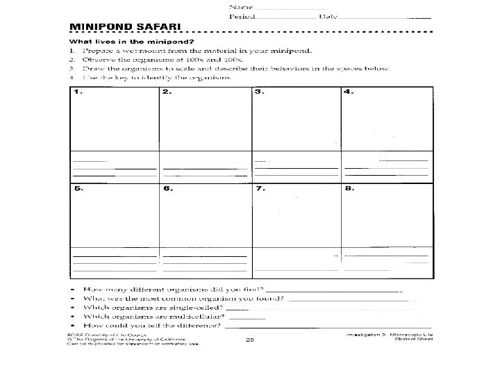 WORD BANK • Multicellular- organism containing more than one cell (parts like legs, guts, feelers, etc). • Unicellular- a one-celled organism. • Diapause- organism in hibernation waiting for aquatic environment.