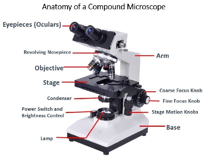 • Coarse focusing knob - Used to make relatively wide focusing adjustments to the microscope. • Fine focusing knob - Used to make relatively small adjustments to the microscope. • Body - The microscope body. • Ocular eyepiece - Lens on the top of the body tube. It has a magnification of 10× normal vision.